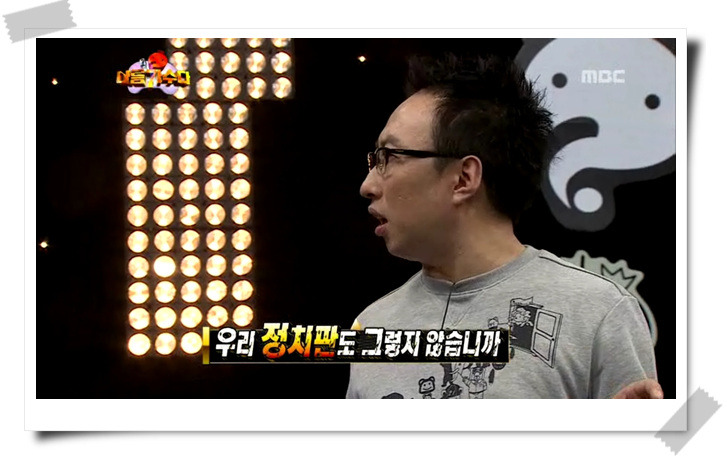 '나가수'에서 탈락 논란에서 원칙을 지켜야 한다고 주장했던 박명수는 자신의 차례에서 리쌍의 노래를 선택하며 세 번이나 번복하는 그의 모습은 모순의 대명사로 불려도 좋을 정도였습니다. 합의도 없이 연속으로 돌림판을 돌린 명수는 '사랑은'이 연속 두 번 선택되며 당혹스러운 재미를 만들었습니다. 마치 '나가수'를 패러디하고 풍자하기라도 한 듯 만들어진 상황극은 흥미로웠습니다.