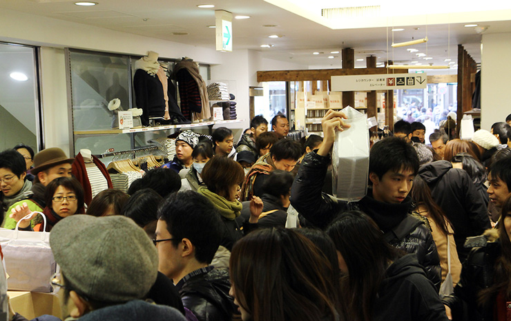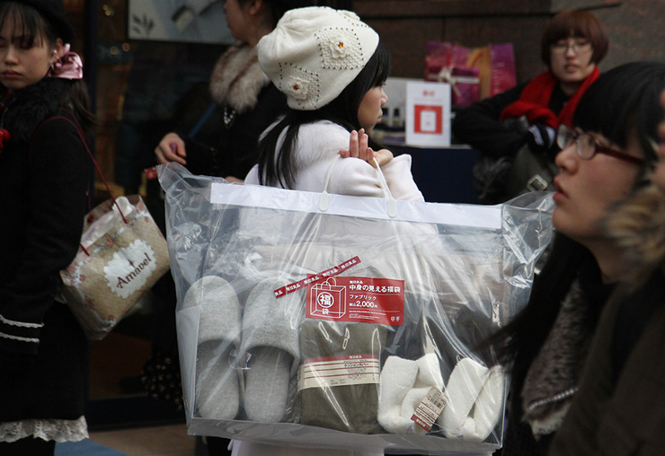 후쿠부쿠로 (福袋)라는 복 주머니라는 의미의 상품을 팔기 시작하며, 세일이 시작되기 때문에 이를 노리고 모인 사람들로 북적북적