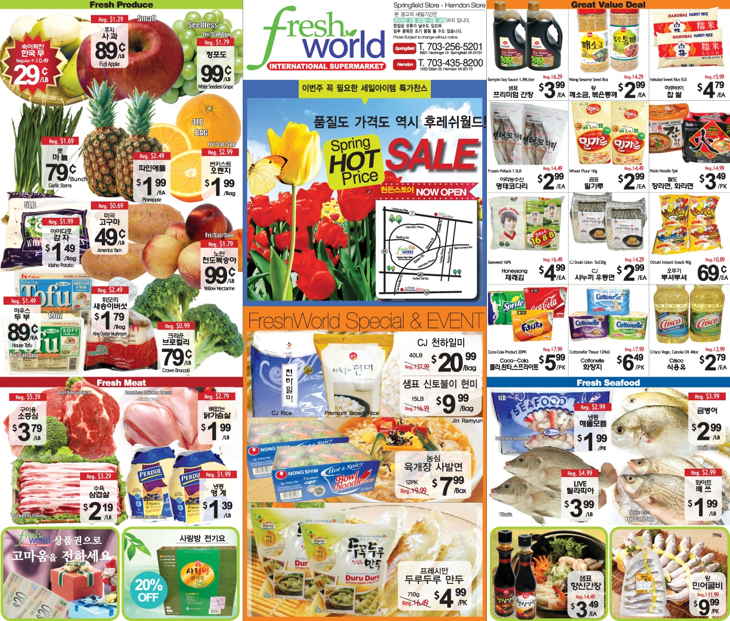 후레쉬월드 Fresh World (스프링필드)6901 Hechinger Dr Springfield, VA 22151703-256-5201Store Hours: 08:00 AM-11:00 PM후레쉬월드는 버지니아의 스프링필드와 메릴랜드의 디스트릭하이츠에 위치한 대형 인터네셔널 그로서리 스토어 입니다. 싱싱한 야채와 고기, 생선을 비롯하여 수많은 다국의 그로서리 물건들을 판매하고 있습니다.http://www.freshworld.us/main/main.phtml