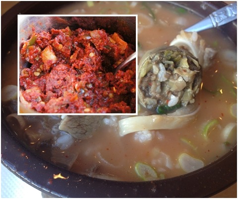 '제일식당'에서 순대국을 먹었습니다. 양념이 따로 준비되어 있어서 취향대로 넣어 먹으면 되요. 저는 매운 걸 좋아해서 양념을 많이 넣었고 담백한 걸 좋아하는 요술상자님은 그냥 드시셨습니다.