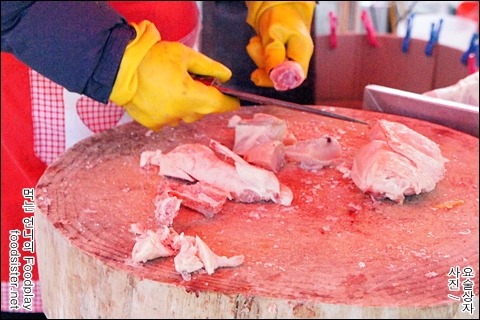 어렸을 때 시장에선 자주 보던 모습입니다. 요즘의 마트에서도 탕탕~ 생선을 토막내주긴해도 저런 도마는 잘 안 쓰죠. 오일장을 다닐 때 재미있는 건 역시 어렸을 때의 기억을 되살릴 수 있어서이기 때문입니다.