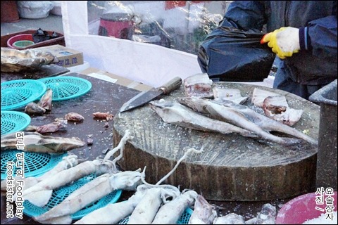 골목으로 들어가니 듬성듬성 판이 벌어져 있습니다. 생선들도 꽝꽝 언 것들이 주로 나와있었어요. 생선들 앞에 수북히 쌓여있는 홍합을 보자니 뜨끈뜨끈한 홍합탕이 생각나더라구요. 그래서 5,000원어치 구입했습니다. 2kg주십니다.