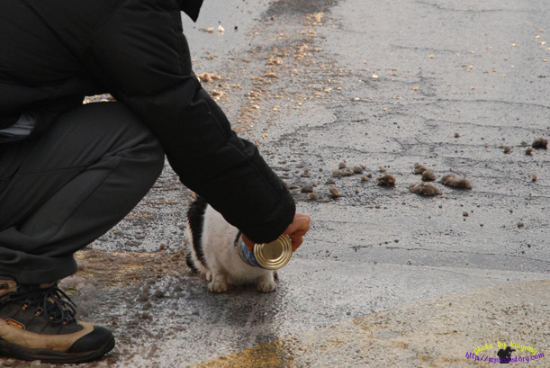 우선은 제가 할 수 있는 모든 것을 해보기로 하였습니다. 추위와 공포에 떨고 있는 고양이의 등을 쓰다듬어 주니 가만히 있더군요. 무엇보다도 앞을 못 보는 상황이다 보니 가만히 있을 수밖에 없었겠지요. 그리곤 한손으론 몸집을 잡고 다른 한손으론 깡통을 잡아 살짝 힘을 줘 봤습니다.